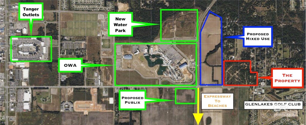 44.23 +/- acres - assemblage of 11 contiguous tax parcels - approved mixed-use City of Foley PUD - Currently approved for a 9-bay retail strip center, 108 condominiums in two buildings, 26 townhouses, and 82 SFRs. LISTING BROKER MAKES NO REPRESENTATION OF ACREAGE ACCURACY. BUYER TO VERIFY. Buyer to verify all information during due diligence.