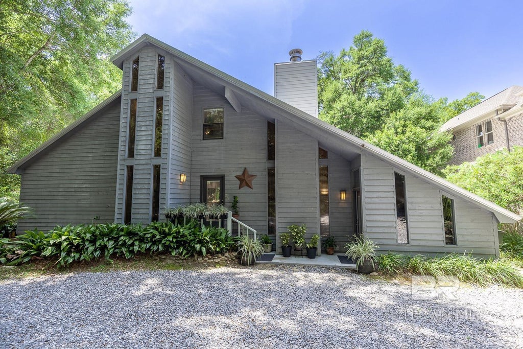 This Old Town Daphne gem is full of soul, sunshine, and stories waiting to unfold! Just one block from May Day Park and the sparkling Mobile Bay, you'll have the pier for fun and fishing, public boat launch, and a playground practically in your front yard but with the privacy of your own lush, fully fenced and maturely landscaped backyard. Inside, this home has charm for days: Contemporary architectural style with cedar siding, main room vaulted wood ceiling with and a wood burning fireplace, warm hardwood floors, a beautifully renovated kitchen space, and a unique bonus feature that all rooms have sliding glass doors out to the deck facing the beautiful backyard. The layout of this home is very flexible with two of the bedrooms on the main level with a full hall bath, the third bedroom is on the opposite side of the large main room and has a private entrance and full bathroom. The upstairs could be used as the primary bedroom and has a small separate loft overlooking the living room and the bedroom has lots of space with a full bath, extra dressing area and a private balcony. The kitchen updates were completed in 2023 and include an induction stove and fabulous Iceberg Quartzite counter tops. The metal roof, hot water heater and HVAC were replaced just a few years ago. So many different possibilities and a home that you need to see inside to appreciate. Buyer to verify all information during due diligence.