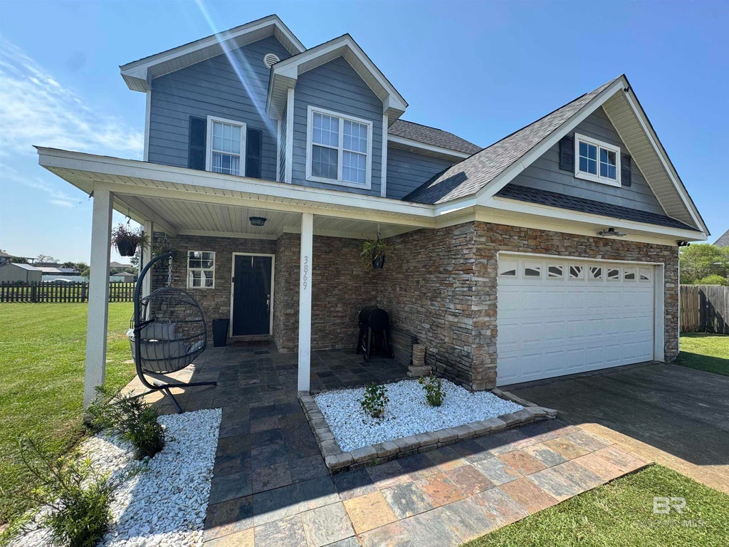 Welcome to 3869 Emerille Drive in Foley! This 3-bedroom, 2.5-bath home is located in the quiet Kennedy Park subdivision and offers 1,713 square feet of comfortable living space. Step inside to an open layout with durable vinyl plank flooring throughout—no carpet here! The living area flows seamlessly into the dining space and kitchen, making it ideal for everyday living or entertaining guests. The primary suite features a double vanity, soaking tub, separate shower, and a spacious walk-in closet. Two additional bedrooms are located on the opposite side of the home for extra privacy. Outside, the covered front porch is enhanced with modern recessed LED lighting that adds both style and curb appeal. The backyard is fully fenced and ready for pets, gatherings, or relaxation. Conveniently located near schools, shopping, and local dining.Home is being sold as-is. Buyer to verify all information during due diligence.